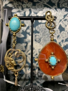 Выполнены из ювелирной бронзы, сердолика и бирюзы, застёжка-пусеты из серебра.